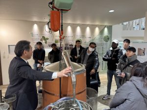 (株)北見ハッカ通商では、永田社長より、ハッカ油の瓶詰め工程の機械化の様子やハッカの歴史・特徴などについて説明をいただきました。北見ハッカは、かつて1930年代には、菓子や飴のほか、メンソレータムなど医薬品やたばこ(メントール)などに使用され、世界市場の約7割を占めるほど有名な産地であったことや、北見工業大学との共同研究について紹介があり、留学生からは、「自分が住んでいる街にこんなにすごい企業があるとは知らなかった」「ミントやメントールなど身近に使われていると知り、ハッカについてとても興味を持った」など感想が寄せられていました。